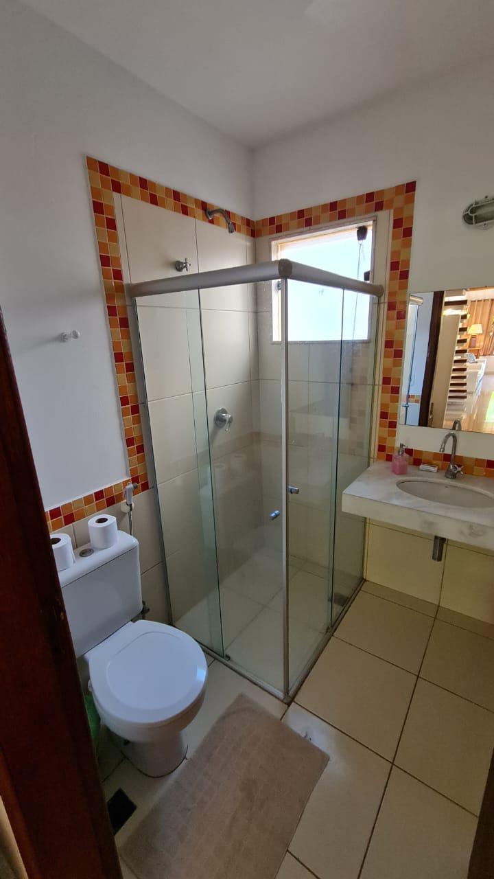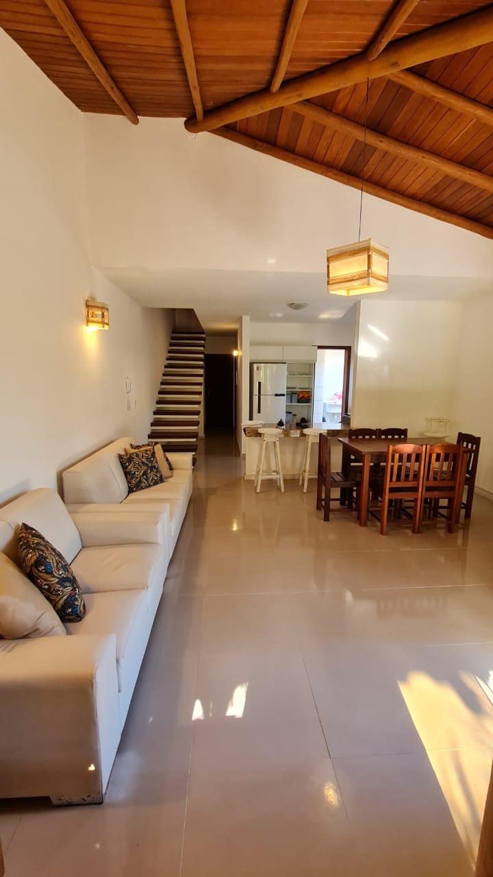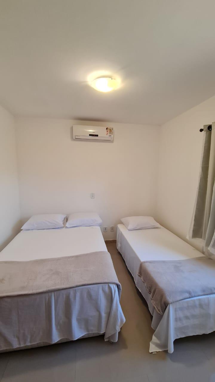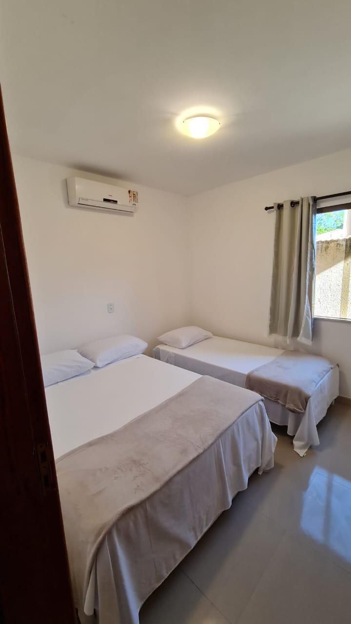 Estrutura: 3 quartos (2 suítes no 2º andar, 1 quarto com banheiro social no 1º andar), sala de estar, cozinha equipada, área de serviço, varanda, ar-condicionado em todos os quartos, Wi-Fi e TV a cabo.